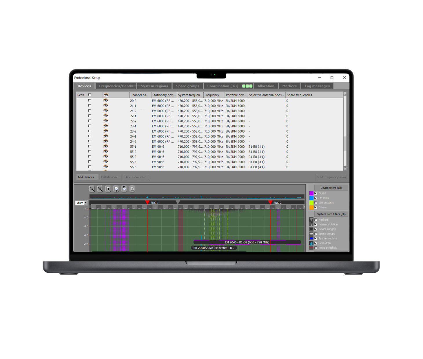 Set up your personal wireless environment even without your active devices and without being on location. WSM allows you to plan every show virtually. While you have access to the same WSM data from up to six computers, you can be sure that your show runs smoothly with the spectrum analyzer. Groupable scenes allow for a better overview.