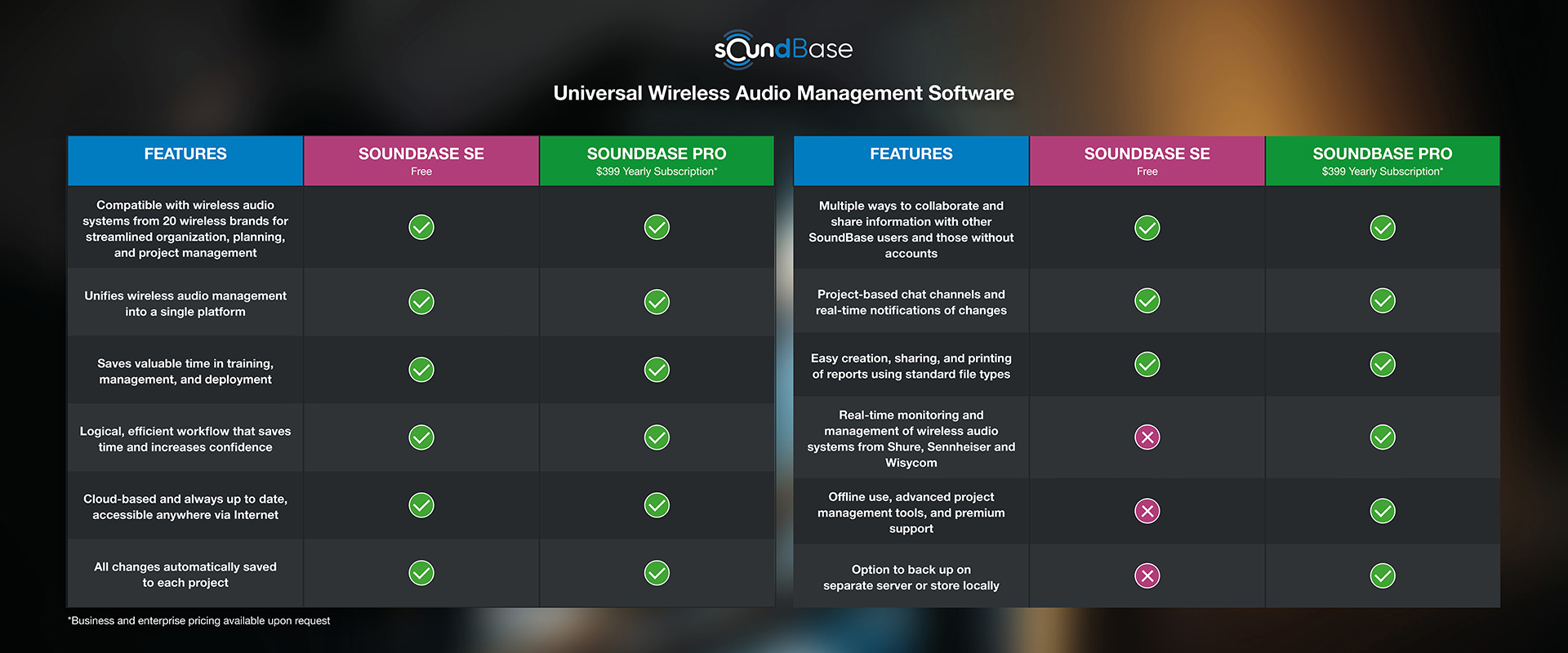 Built by live audio professionals for live audio professionals, SoundBase is a software that unifies your wireless audio workflow into a single, simple, and flexible platform. SoundBase works seamlessly with systems from Shure, Sennheiser, and Wisycom and is backed by a passionate community, so it’s constantly updated based on user feedback. Get SoundBase SE for free or choose SoundBase Pro for even more powerful capabilities.