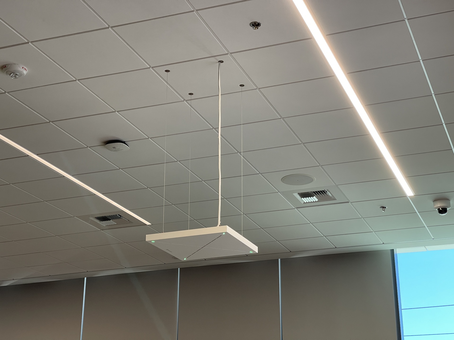 TCC 2 beamforming ceiling microphones. Standard conference rooms featured one or two displays, a ceiling mic, six speakers, a camera, and a room scheduler, all operable via a central touch panel.