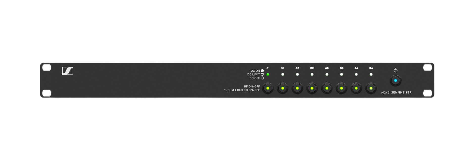 - LED は入力状態を示します。RF オン、直流オン、直流電流過負荷(例:「ショート」したアンテナケーブルの故障)